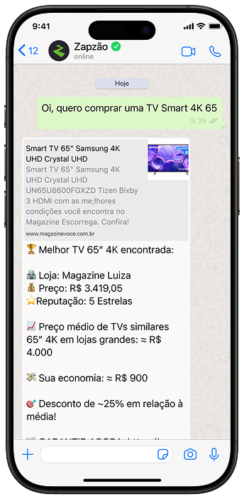 Depois que você envia, nossa IA irá realizar uma busca em mais de 50 lojas e te manda o menor preço encontrado em segundos.
